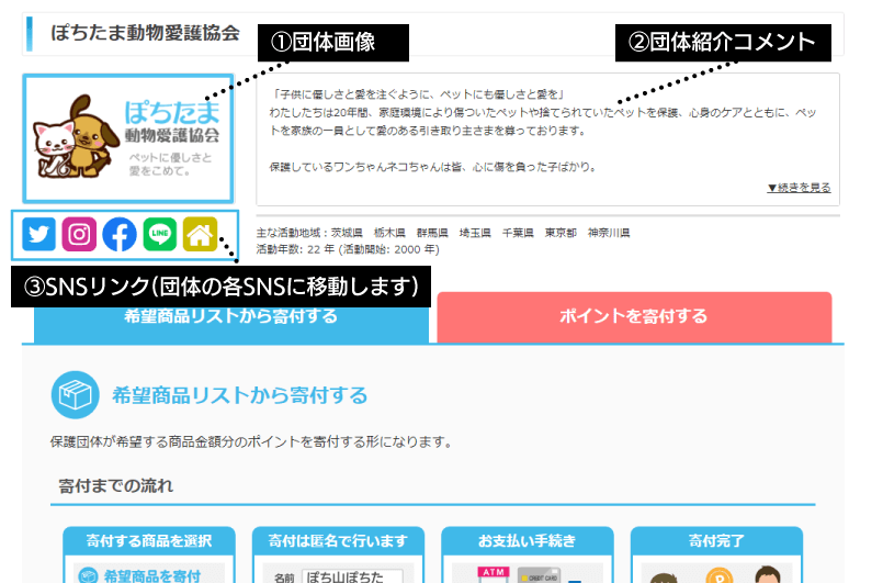 保護団体への寄付は主にこちらの詳細ページから行っていきます。