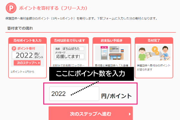 ポイント入力欄に寄付したいポイント数を入力します。