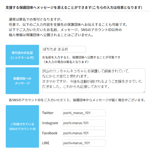 他にも、今回の寄付と一緒に保護団体へメッセージを添付できます。