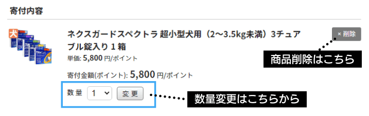 寄付商品の数量の変更、削除はこちらからも可能です。