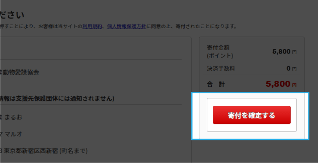 [寄付を確定する] ボタンで寄付の受け付けが完了します。