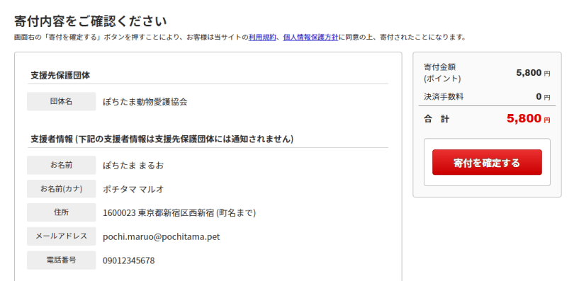 [寄付を確定する] ボタンで寄付の受け付けが完了します。