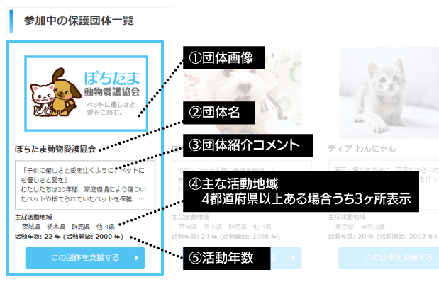 一覧ページに表示されている保護団体から各保護団体の詳細ページに入っていきます。